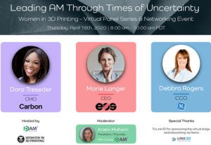 Starting tomorrow, April 16th, Women in 3D Printing (Wi3DP) will be hosting a global digital panel, supported by Link3D and led by AM-Cubed, that meets each month to feature women leaders who are enabling AM. The first session, titled “Leading AM Through Times of Uncertainty,” is Thursday, April 16, 8-10 am PST, and participants are Dara Treseder, CMO of Carbon; Marie Langer, CEO of EOS; Debbra Rogers, CCO of GE Additive; and moderator Kristin Mulherin, the President and Founder of AM-Cubed.