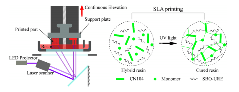 Dual-curing systems have been known to offer a high curing rate—along with better performance, such as improved mechanical properties and toughness. And, while many photopolymer 3D prints may be the result of dual-curing systems, in this study the researchers focus on the use of bio-based resins for stereolithography (SLA). They combine urethane-modified soybean oil with an epoxy group (urethane epoxidized soybean oil; SBOURE) to strengthen impact resistance of cycloaliphatic diepoxide, a binary monomer additive.